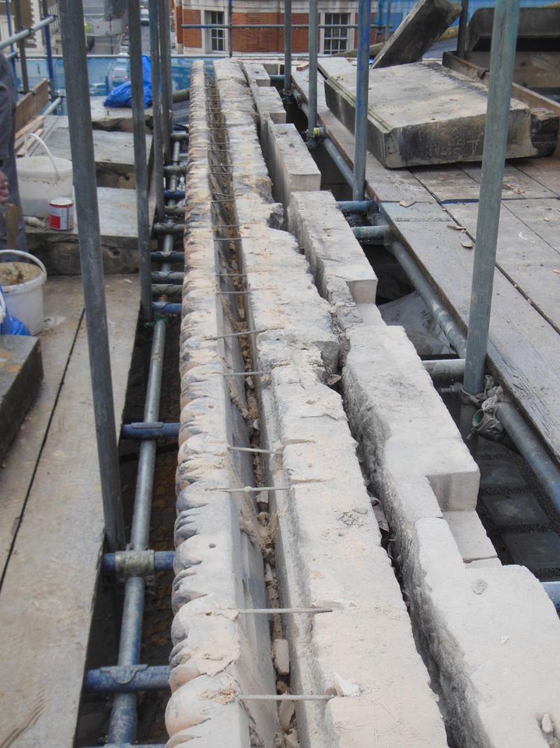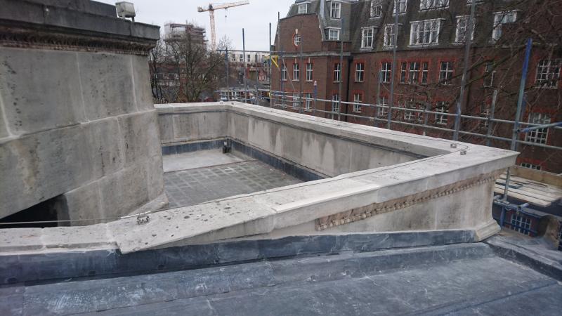 The Portland stone and terracotta dressings were fracturing due to the rusting and expansion of the original ferrous metal cramps. The copings and terracotta dressings were recorded and carefully dismantled and re-fixed using austenitic stainless steel fixings with severely damaged units replaced or, where salvageable, repaired with a combination of mortar repairs and indents.